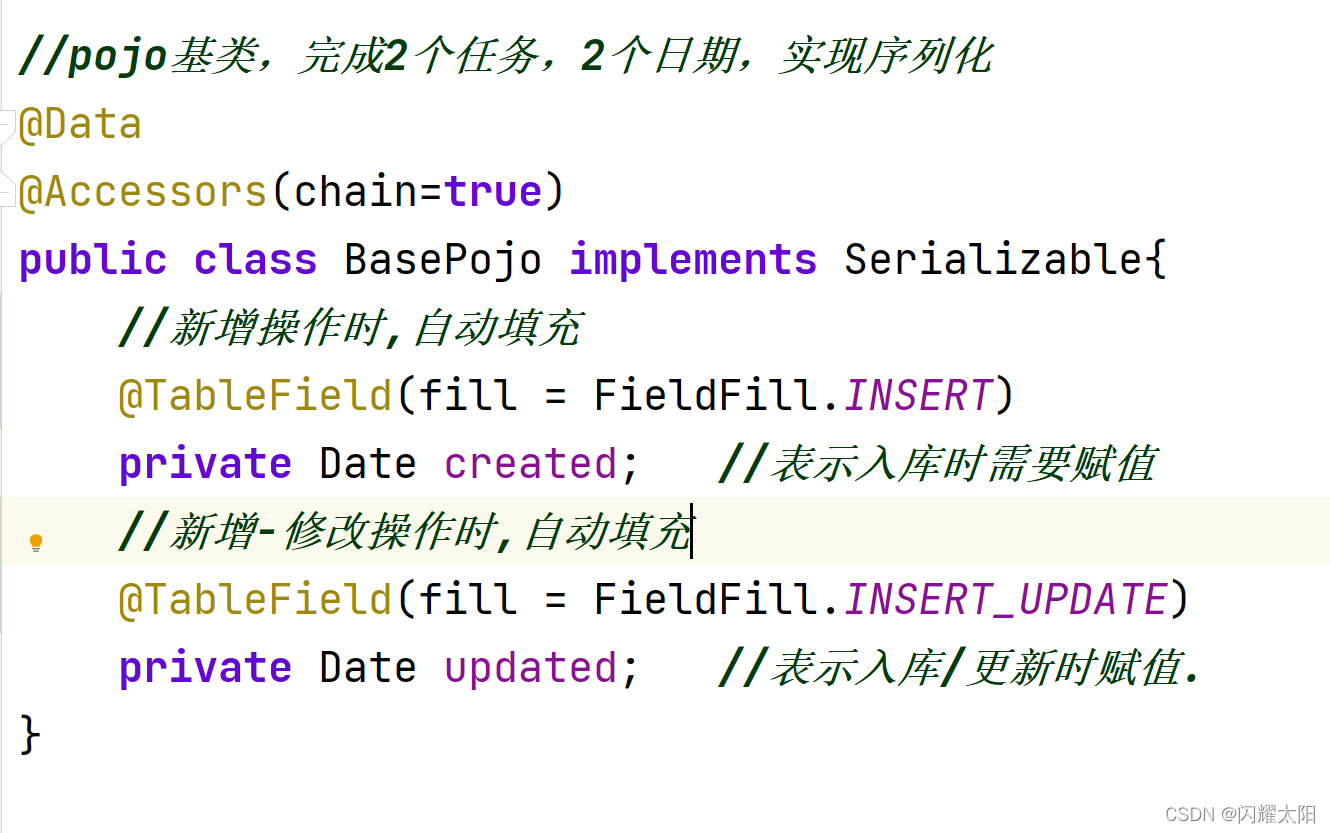 //MP原则: 对象操作数据库,根据对象中不为null的属性进行操作 @Override @Transactional //事务控制 public void updateStatus(ItemCat itemCat) { itemCat.setUpdated(new Date()); //可以被优化!!! //update user set status=xx,updated=xx where id=xx itemCatMapper.updateById(itemCat); } 1.5 MP数据自动填充功能