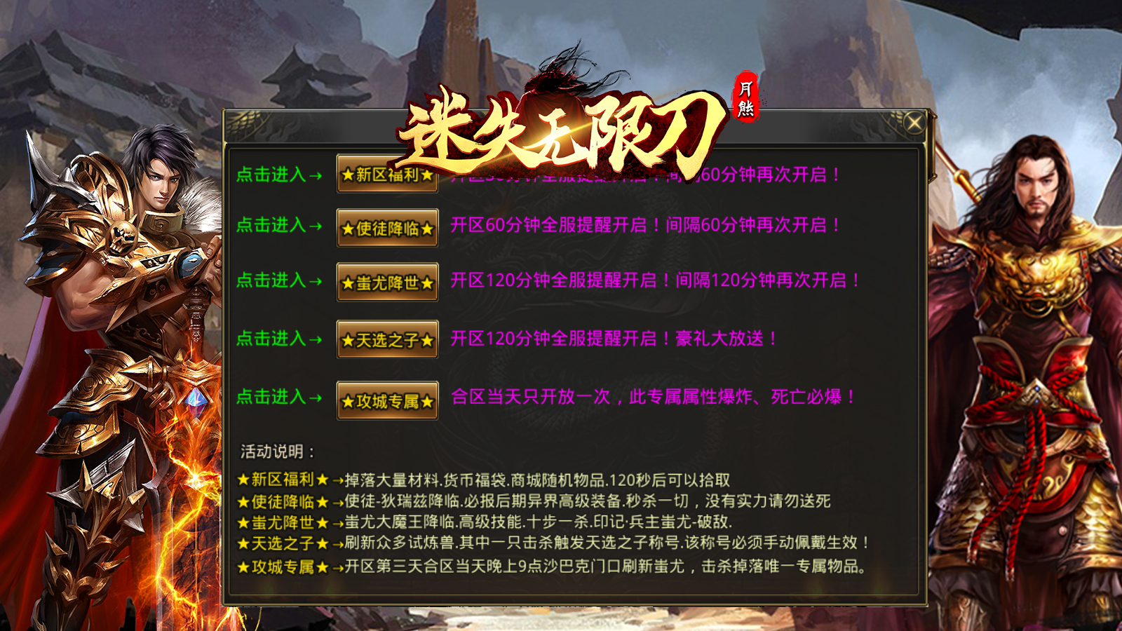 1.服务器名:月熊迷失无限刀 2.网站地址:http://www.yxms.top:7018 3.苹果下载地址:https://www.567fenfa.cn/zv3azf 4.安卓下载地址:https://www.567fenfa.cn/zv3azf 5.PC(电脑)下载地址:暂无 游戏版本:迷失、单职业、1.95 一:游戏介绍 月熊迷失无限刀,是由知名游戏公司月熊网络倾情打造的一款超高人气热血传奇。 这款游戏由3D真实特效打造,融合丰富多样的玩法剧情,炫酷超燃的技能特效, 更有超高爆率神装,让你轻松杀怪,装备爆满屏! 送炫酷华丽时装,各大神器!轻松秒杀各种地图BOSS,无限攻速神器! 让你体验丰富玩法,亮出炫酷技能,领取超多任务, 开启最精彩的传奇人生! 二:玩法特色 送自动挂机,时装,各种炫酷神器! 各大地图均刷BOSS,散人也可无压力单挑BOSS,告别暗坑! 所有装备一切靠打,散人出神器,爆率全开,花钱都不好使! 上线即获得新人豪礼,挂机也能打充值,装备秒回收! 剧情饱满,独特玩家排行榜,众多传奇大神一览无余! 三:游戏攻略 [微信礼包]:免费领取微信福利礼包,前面打怪无压力 [QQ群礼包]:YXWL6666,赠送专属装备与白金会员称号 [盒子礼包]: 赠送盒子称号,获得大幅度爆率提升与大量材料 [赞助礼包]:本F会员分三档,满会员100,送强力特殊,与大量材料,人物倍功,爆率,高级称号。